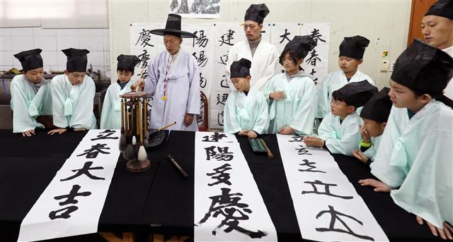 입춘을 나흘 앞둔 31일 충남 논산시 연산면 양지서당에서 유복엽 훈장이 서당 아이들에게 ‘입춘대길’(立春大吉)과 ‘건양다경’(建陽多慶) 등 서당 문에 붙일 축원 글귀를 설명하고 있다. ‘봄이 시작되니 크게 길하고, 경사스러운 일이 많이 생기기를 기원한다’는 뜻이다.