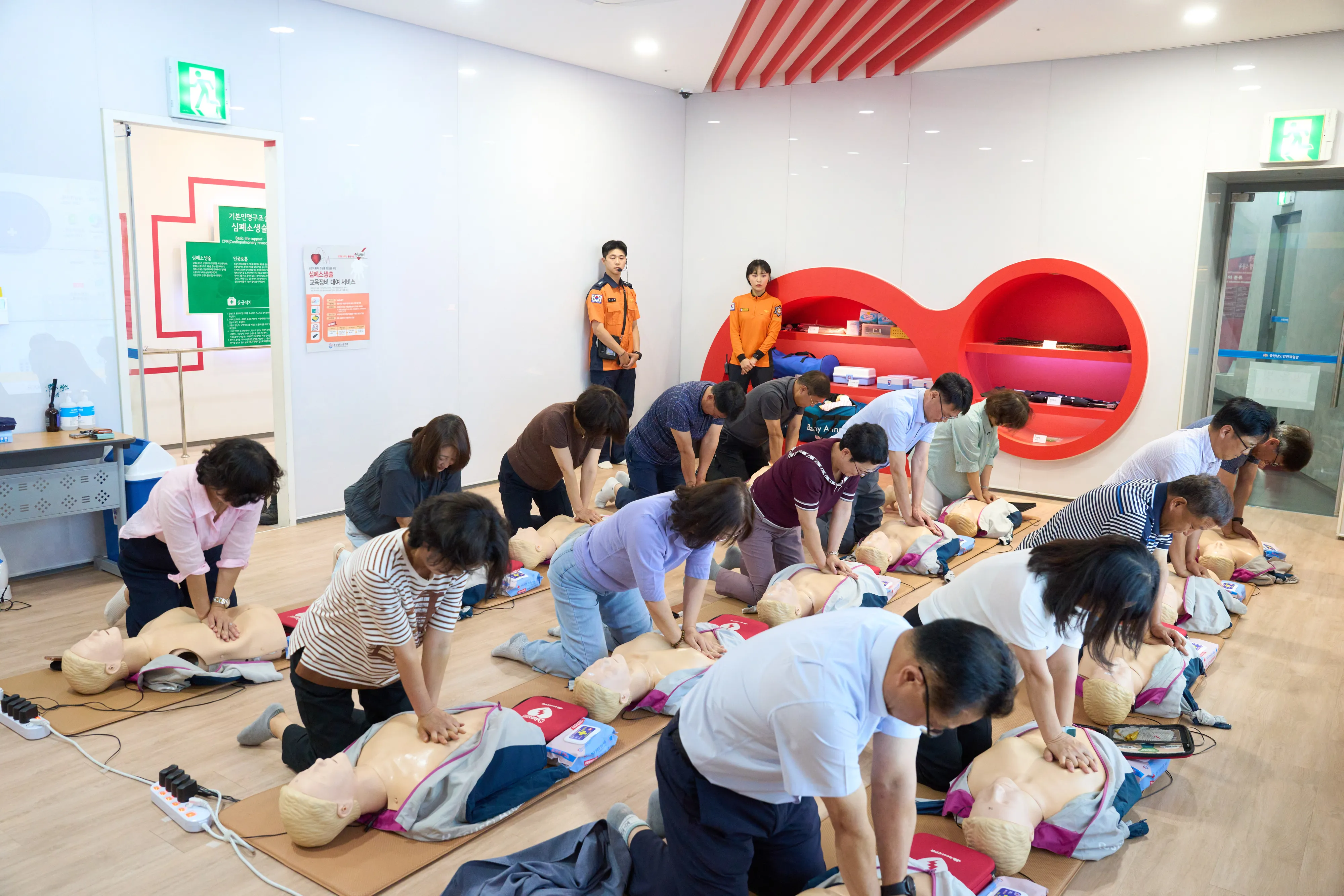 교육 첫날 직원들은 장비를 착용하고 고층 건물에서 완강기를 이용해 탈출하는 훈련을 받았다. 시뮬레이션을 통해 태풍·홍수·지진 등 자연 재난 발생 상황도 체험했다. 테러·화재 등 사회재난 발생에 대비한 초기 대응 임무를 점검했다. 신속한 응급처치를 위한 심폐소생술(CPR)과 자동제세동기(AED) 사용법도 실습했다.
