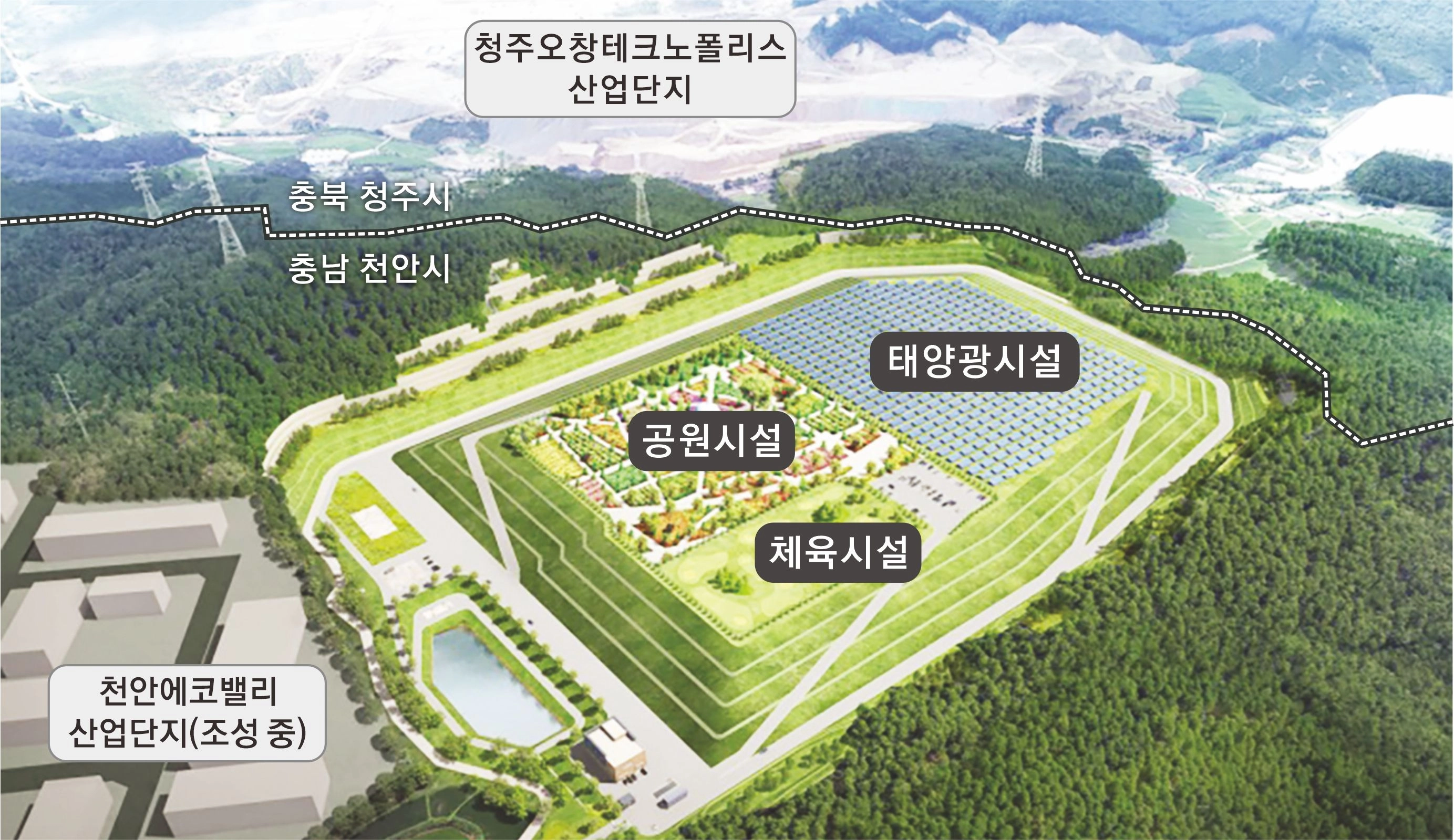 천안시는 천안에코파크㈜가 동면 수남리 38만 6343㎡ 용지에 사업장폐기물 매립시설 조성을 추진하고 있다고 21일 밝혔다. 상부 4단, 하부 6단의 4개 돔형 매립시설을 단계별로 설치할 계획이다. 총매립 면적은 20만 4900㎡로 축구장의 28배 크기다. 매립 용량은 약 670만㎥로 국내 최대 규모다.