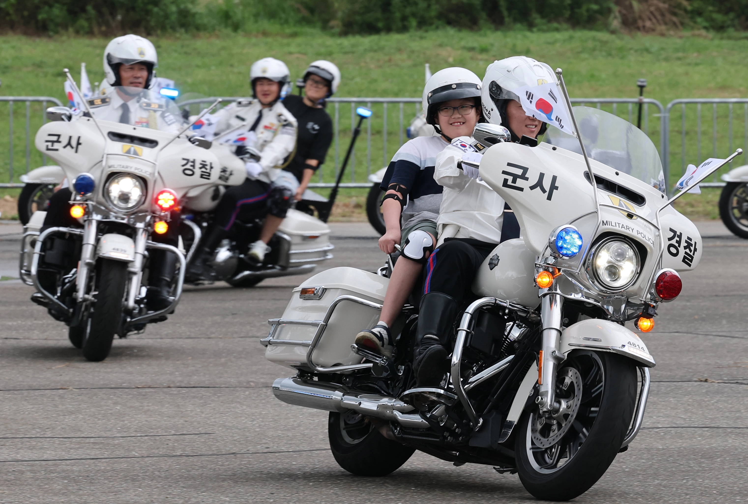 충남 계룡대 활주로에서 열린 ‘2025 계룡군문화축제·지상군페스티벌’에서 아이들이 군사경찰 모터사이클에 올라 체험을 하고 있다. 축제는 21일까지 이어진다.