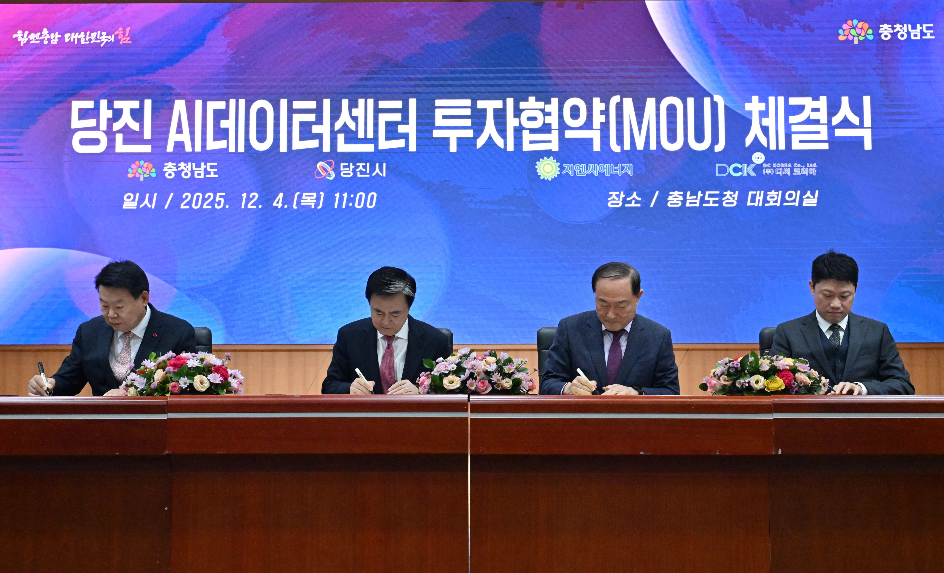 김태흠 충남지사는 4일 오성환 당진시장, 안병철 지엔씨에너지 대표이사, 정영훈 디씨코리아 대표이사와 당진 AI 데이터센터 건립을 위한 투자협약(MOU)을 체결했다. 지엔씨에너지는 디씨코리아 등과 특수목적법인(SPC)을 구성해 당진 석문국가산업단지 내 3만 3673㎡ 부지에 2031년까지 2조원을 투자해 7만 2885㎡ 규모의 160㎿급 AI 데이터센터를 건립할 예정이다. SPC는 200여명의 신규 고용 인력을 지역에서 우선 채용하기로 했다. 또 데이터센터 건립과 운영 과정에서 3500여명의 고용 창출과 지역 경제 활성화가 기대된다.
