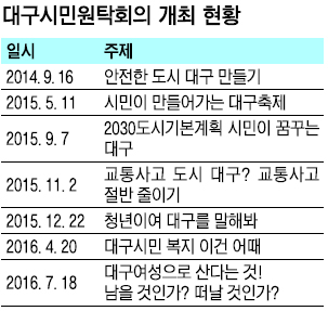 지난해에는 4차례 시민원탁회의가 열렸다. 5월 11일에 ‘시민이 만들어 가는 대구축제’, 9월 7일 ‘2030년 도시기본계획 시민이 꿈꾸는 대구’, 11월 2일 ‘교통사고 도시 대구? 교통사고 절반 줄이기’, 12월 22일 ‘청년이여, 대구를 말해 봐’ 등의 주제로 개최됐다.