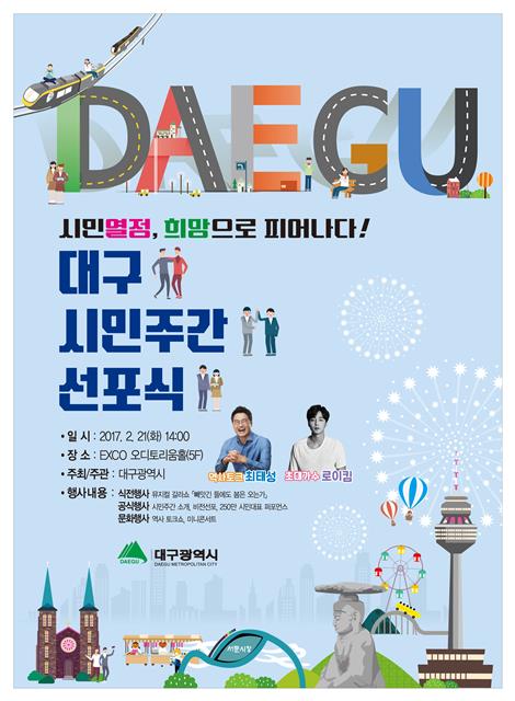 메인행사가 마무리되면 축하행사도 준비돼 있다. EBS 국사 선생이자 ‘KBS 역사저널 그날’의 출연자이기도 한 최태성 강사가 ‘역사 속의 대구’를 주제로 강연한다. 슈퍼스타K 시즌 4의 우승자이자 ‘봄봄봄’, ‘러브 러브 러브’ 등으로 인기를 끈 가수 로이킴이 미니콘서트를 준비해 새로운 시민축제의 탄생을 축하하게 된다.