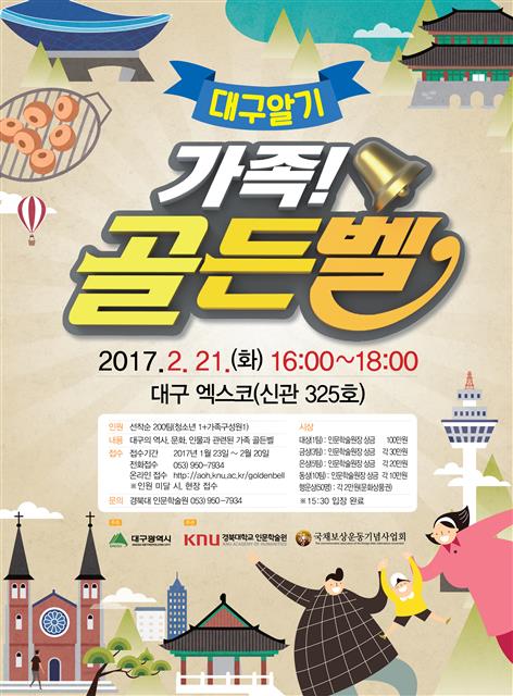 선포식에 앞서 국채보상운동을 기념하는 행사가 대구중앙도서관 강당에서 열린다. 권 시장, 류 의장 등 150여명이 참석할 예정이다. 참석자들은 국가를 대신해 나랏빚을 갚기 위해 나선 선열들의 책임정신을 되새긴다. 오후 4시부터는 엑스코 325호실에서 ‘대구 알기 가족 골든벨’이 열린다. 초·중·고등학생들이 가족 1명과 1팀으로, 모두 200여팀이 참가한다. 예선과 패자부활전 본선 등을 거쳐 20팀을 선발해 시상한다. 대상 1팀에게는 100만원, 금상 3팀 각 90만원, 은상 3팀 각 60만원, 동상 10팀 각 10만원의 상금을 준다. 문제는 대구의 문화, 역사, 인물, 기타 인문소양 등에서 나온다.