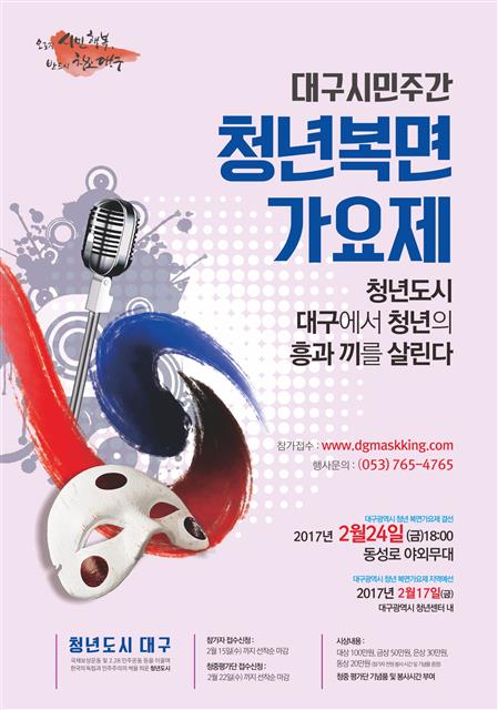 24일 오후 6시부터 동성로 야외무대에서 ‘청년복면가요제’가 열린다. 지역 청년들이 직접 기획해 추진하는 것이다. MBC 인기 프로그램인 ‘복면가왕’에서 모티브를 얻었다. 참가자들은 청년 예술가들이 제작한 사과, 팔공산 등 지역 상징물 복면을 쓰고 가창대회를 펼친다. 복면가요제 예선은 17일 오전 10시 대구시 청년센터에서 열린다. 예선을 통해 선발된 100명이 심사위원인 시민청중평가단 앞에서 진검승부를 벌인다. 대상과 금상, 은상 각 1명에게 100만원, 50만원, 30만원의 상금을 지급하고 장려상 1명에게도 20만원을 준다. 참가자 전원에게는 2만원 상당의 상품을 지급한다.