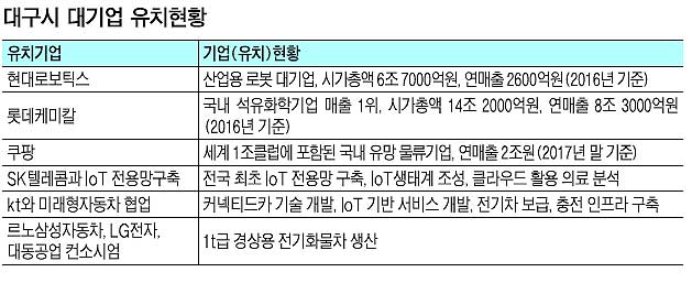 -현대로보틱스 입주로 인해 대구는 명실상부한 대한민국 로봇산업의 중심도시로 자리매김했다. 또 한국로봇산업진흥원을 비롯해 글로벌 경쟁력을 갖춘 기업인 야스카와전기, KUKA 유치에 잇달아 성공했다. 현대로보틱스 협력업체 동명전기 등 5개 업체를 추가 유치해 현대로보틱스 클러스터를 조성했다. 이 덕분에 연간 250여명의 직원이 달성군 현풍에 근무하고 이들의 소비활동을 통해 지역경제 활성화에 기여할 것으로 기대한다. 국가산업단지, 대구테크노폴리스, 첨단의료복합단지, 수성의료지구 등 기반시설이 잘 조성돼 있다. 섬유·기계 산업의 구조 고도화와 미래 신성장 산업 선점 등으로 산업생태계의 체질도 개선됐다. 대구에 투자하는 대기업에 대해서는 공장부지 무상제공, 고용보조금, 교육훈련보조금, 투자보조금 등 투자금액의 최대 50%까지 보조금을 대폭 지원한다. 공장 설립부터 가동, 정착, 안정화 단계까지 원스톱지원 서비스도 제공하고 있다. 이 같은 파격적인 투자 인센티브 제공에 많은 대기업들이 관심을 가질 것으로 기대한다.