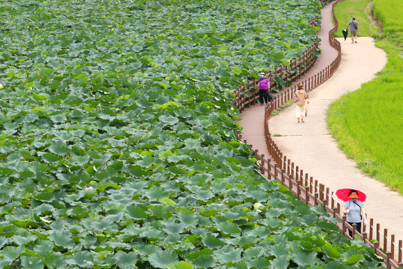세상과는 거리두기… 가을과는 ‘거리 좁히기’  광복절 연휴 마지막 날인 16일 대구 반야월 연꽃단지에서 시민들이 거리두기를 하면서 산책을 즐기고 있다.<br>대구 연합뉴스