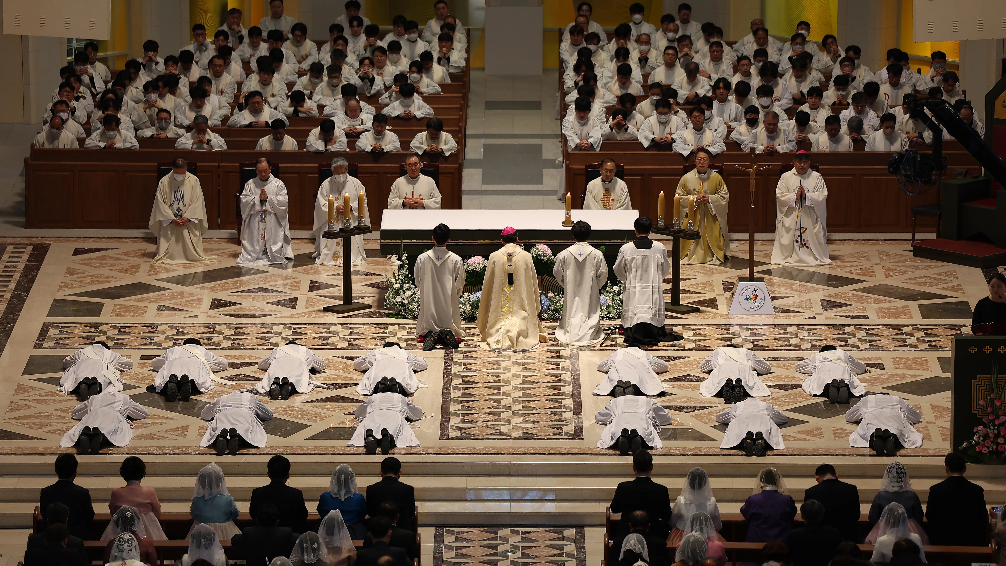 7일 오전 대구 천주교 주교좌 범어대성당에서 열린 ‘2025 대구대교구 사제·부제 서품식’에서 수품자들이 부복 기도를 하고 있다. 부복 기도는 땅에 엎드린 자세로 하느님께 기도를 올리는 것으로 세상에서 가장 낮은 이가 돼 하느님을 경배하겠다는 약속과 기원을 상징한다.