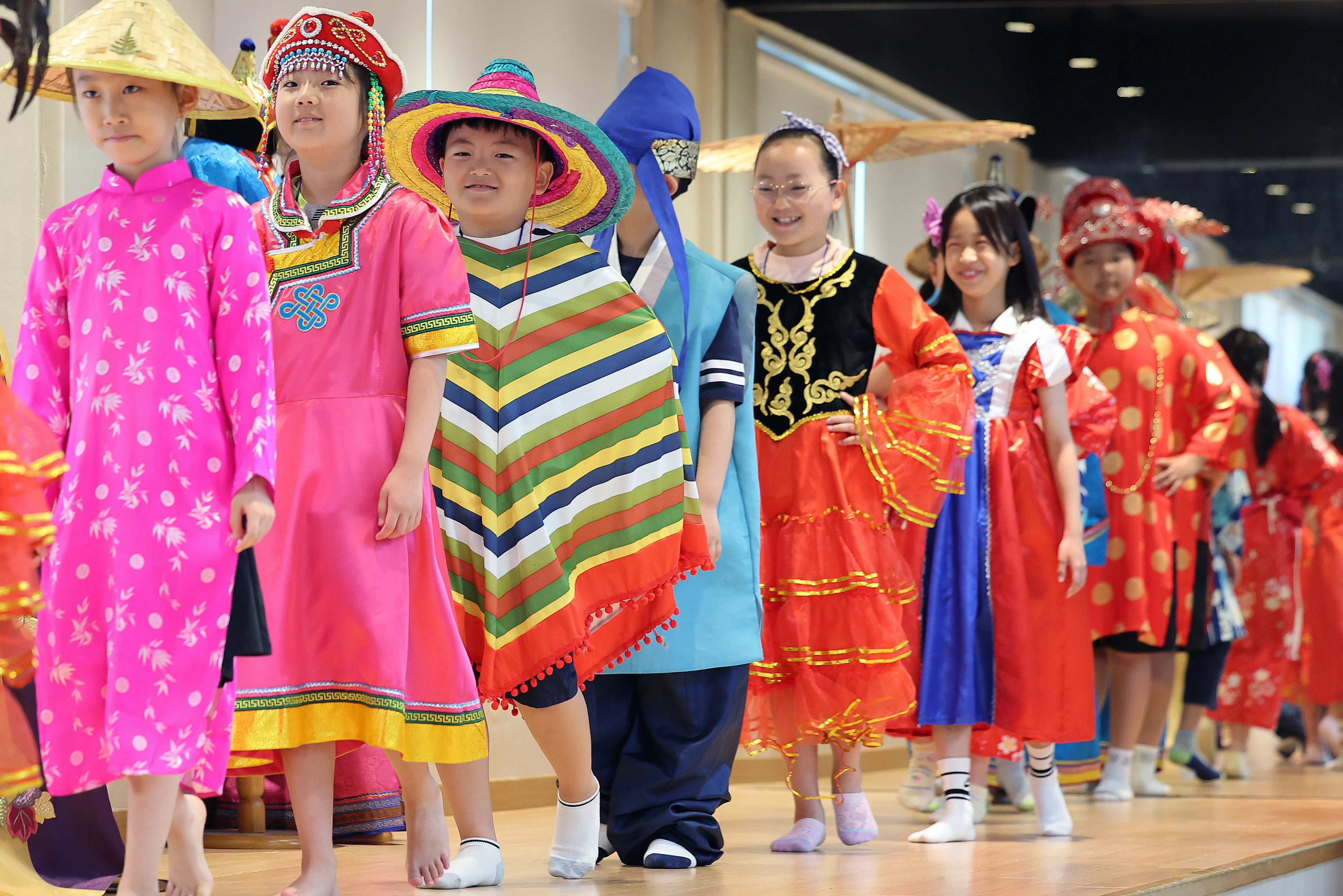 28일 대구 북구 대구세계시민교육센터에서 열린 여름방학 세계문화체험학습에서 초등학생들이 각국 전통의상을 입고 런웨이를 걷고 있다.