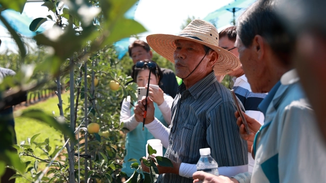 군은 1차로 지난 3월 사과 선도농가 경작지 5㏊에 골든볼 묘목 1만주를 보급했다. 지난달엔 골든볼 과원에서 50여 농가가 참석한 가운데 ‘골든볼 시범사업 교육 및 현장 견학’을 했다.