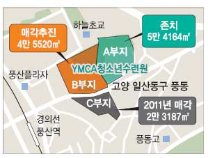 서울YMCA가 청소년을 위한 용도로 기증받은 토지 상당 부분을 매각 추진해 도덕성 논란에 휩싸였다. 경기 고양시는 최근 도시계획위원회를 열어 서울YMCA가 신청한 일산동구 풍동 616-7 일대 일산청소년수련원의 토지(자연녹지) 12만 4200㎡ 중 7만 119㎡<그림 B, C 부지>를 청소년수련시설에서 제외했다고 7일 밝혔다.