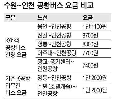 K여객은 이용 요금을 용인~인천공항 구간 1만 1100원, 신갈~인천공항 8700원, 영통~인천공항 8300원, 아주대~인천공항 7700원으로 정했다. 이는 영통~인천공항(1만 2000원), 수원 캐슬호텔~인천공항(1만 2000원)을 운행하는 기존 K공항 리무진 버스 요금보다 3700~4300원 저렴하다.