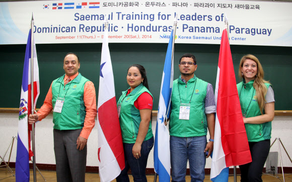 새마을운동중앙회 초청으로 도미니카공화국과 온두라스, 파나마, 파라과이에서 온 교육생(왼쪽부터) 대표들이 11일 경기 성남시에 있는 새마을중앙연수원에서 국기를 옆에 두고 포즈를 취하고 있다. 중앙회는 4개국 공무원과 학자 24명을 초청해 오는 20일까지 새마을운동 세계화 기초과정 교육을 실시한다.
