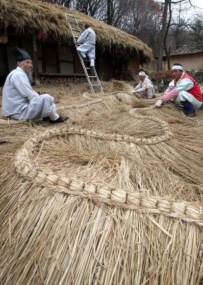 “초가집 위한 맞춤 겨울옷이랍니다”  25일 경기 용인 한국민속촌에서 민속촌 관계자들이 초가지붕에 올릴 용마름과 이엉 엮기 작업을 하며 겨울을 준비하고 있다.<br>연합뉴스