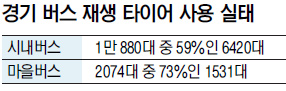 도는 그러나 안전사고 등을 우려해 뒷바퀴에도 새 타이어를 사용할 것을 촉구하지만 대부분의 버스회사들이 비용 절감을 이유로 가격이 싼 재생 타이어를 사용하고 있다. 업계 관계자는 “재생 타이어는 1개 가격이 20여만원으로 일반 타이어의 절반가량에 불과해 영세 운수업체들은 유혹을 뿌리치지 못한다”고 털어놨다.