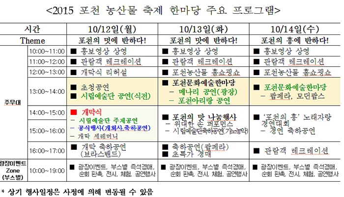 포천시 관계자는 “올해 포천 농산물 축제는 포천의 고품질 농축산물과 포천의 차별화된 문화예술을 선보임으로써 관람객들께 잊지 못할 추억을 만들어 드릴 수 있을 것”이라고 자신했다.