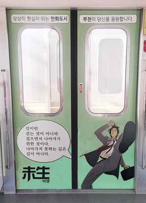 경기 부천시가 19일부터 3개월 동안 지하철 7호선에서 만화가 윤태호의 인기 만화 ‘미생’ 캐릭터들로 내부를 둘러싼 열차를 시범 운행한다. 내년에는 7호선 중 1편성된 열차 8칸의 출입문을 모두 인기 만화 캐릭터로 포장한다.