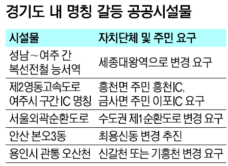 경기 지역 곳곳에서 공공시설물이나 지역 명칭을 둘러싼 갈등이 잇따른다.