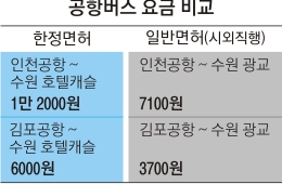 이는 한정면허를 가진 공항버스 요금이 턱없이 비싼 데다 운행거리가 줄더라도 요금을 내리지 않아 결국 이용자들만 피해를 보고 있다는 판단에서다. 게다가 한정면허는 청소년 할인 혜택이 없을 뿐 아니라 좌석 수에 따른 요금 책정 기준도 적용받지 않아 그야말로 ‘황금면허’란 원성을 사고 있다.