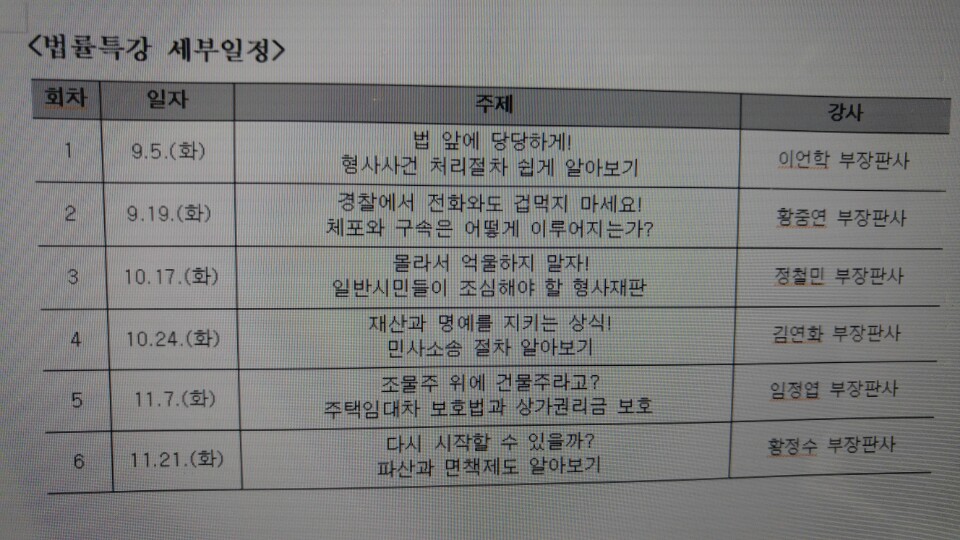 어렵고 멀게 느끼는 법률용어뿐 아니라 법체계와 절차 등을 생활 속 다양한 사례를 들어 알기 쉽게 전달할 예정이다. ‘경찰에서 전화와도 겁먹지 마세요’ ‘체포와 구속은 어떻게 이루어지는가’ 등 다양한 주제로 강의를 마련했다.