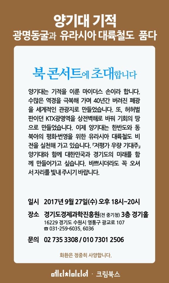 양 시장은 이날 북콘서트를 통해 40년된 폐광을 세계적인 관광지로 개발하기까지 과정과 향후 광명시와 인근 지역의 새로운 성장동력 전망을 소개할 예정이다. 나아가 한반도 평화와 대륙진출을 꿈꾸는 유라시아 대륙철도에 대한 미래 비전을 밝힌다. 또 광명시장 재임기간을 회고하고 국가적 지도자로서 발돋움하기 위한 미래 전략 등을 제시할 계획이다.