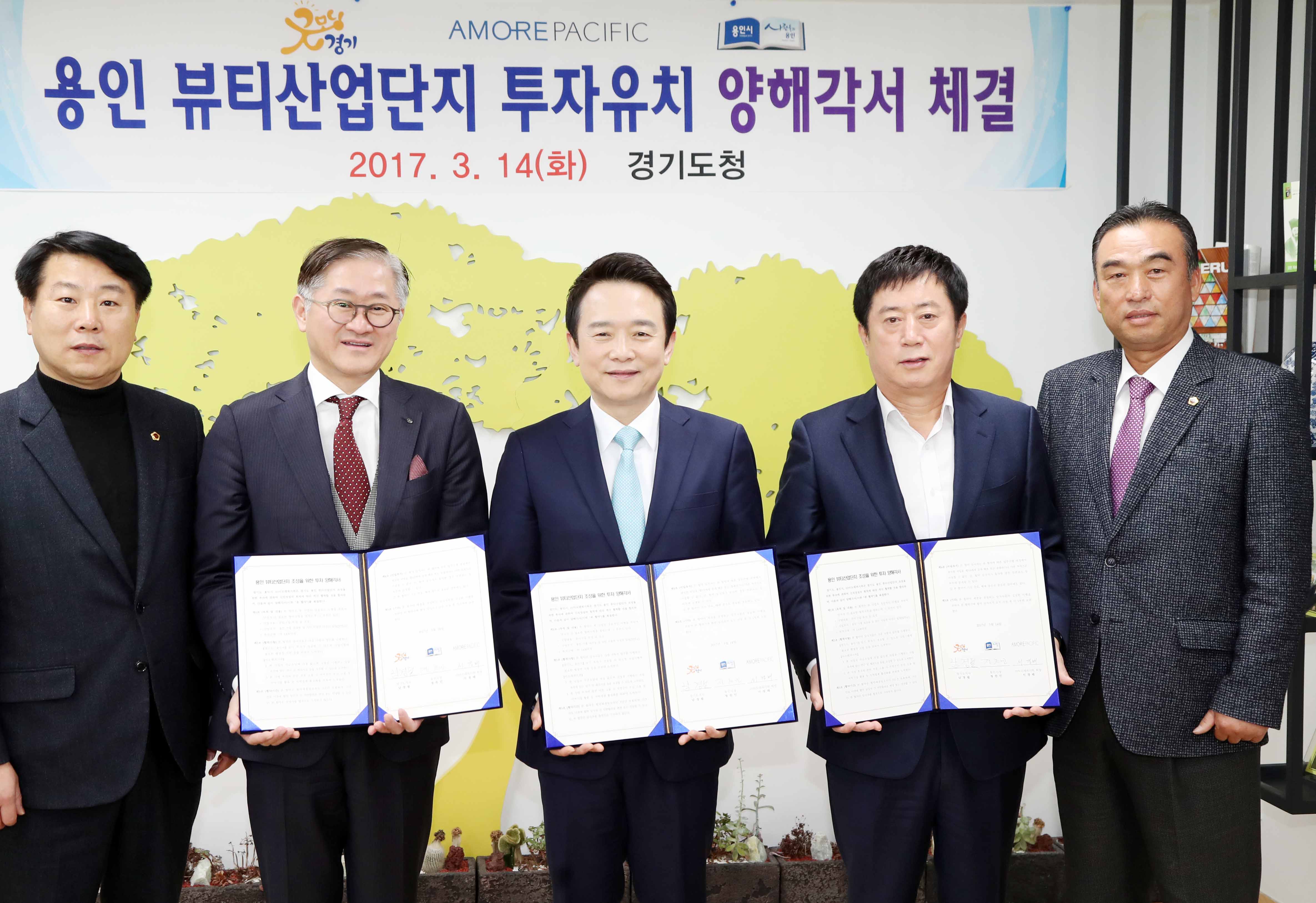 지난 3월 열린 용인 뷰티산업단지 투자유치 양해각서 체결식에서 남경필 경기도지사(왼쪽에서 세번째)와 정찬민 용인시장(네번째)이 기념촬영을 하고 있다.용인시 제공