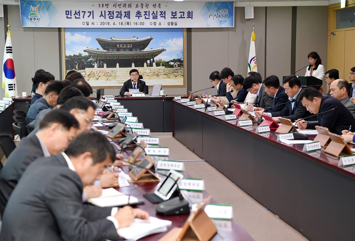 경기 광주시는 18일 시청 상황실에서 신동헌 시장을 비롯한 부시장, 국·소장, 실·과장 등 관계 공무원 50여명이 참석한 가운데 ‘민선7기 2019년도 1분기 시정과제 추진실적 보고회’를 열었다.
