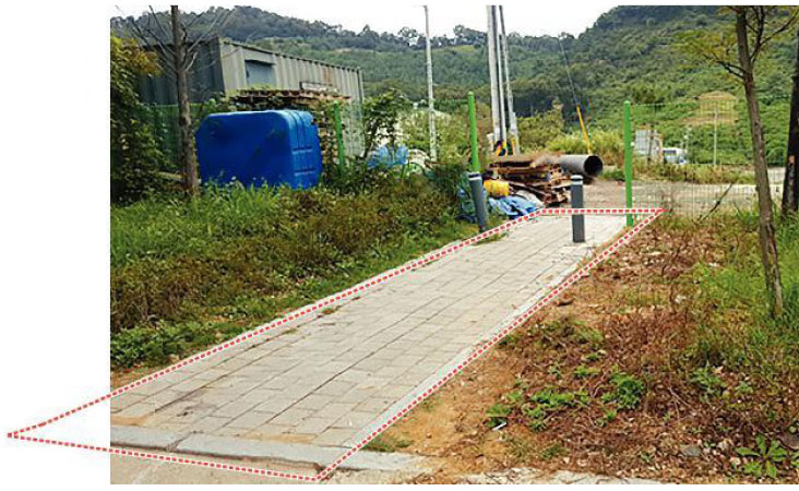 경기 김포시 학운리 양촌산업단지 내 빌라촌과 완충녹지 건너 대포리 빌라촌 사이에 조성한 보행도로(점선 안). 위쪽 대포리 주민들은 도로를 넓혀 자동차를 집으로 다니도록 하자고 주장하는 반면 아래쪽 학운리에선 소음 공해 유발과 교통사고 위험을 높인다며 통행을 막는 철봉을 세우며 거세게 반대해 충돌을 빚고 있다. 김포시 제공