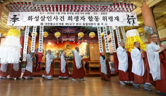 이날 위령제에는 용주사 주지 성법스님과 불자들, 이춘재가 살해했다고 자백한 초등학생 피해자 유족들, 배용주 경기남부경찰청장 등이 참석했다.