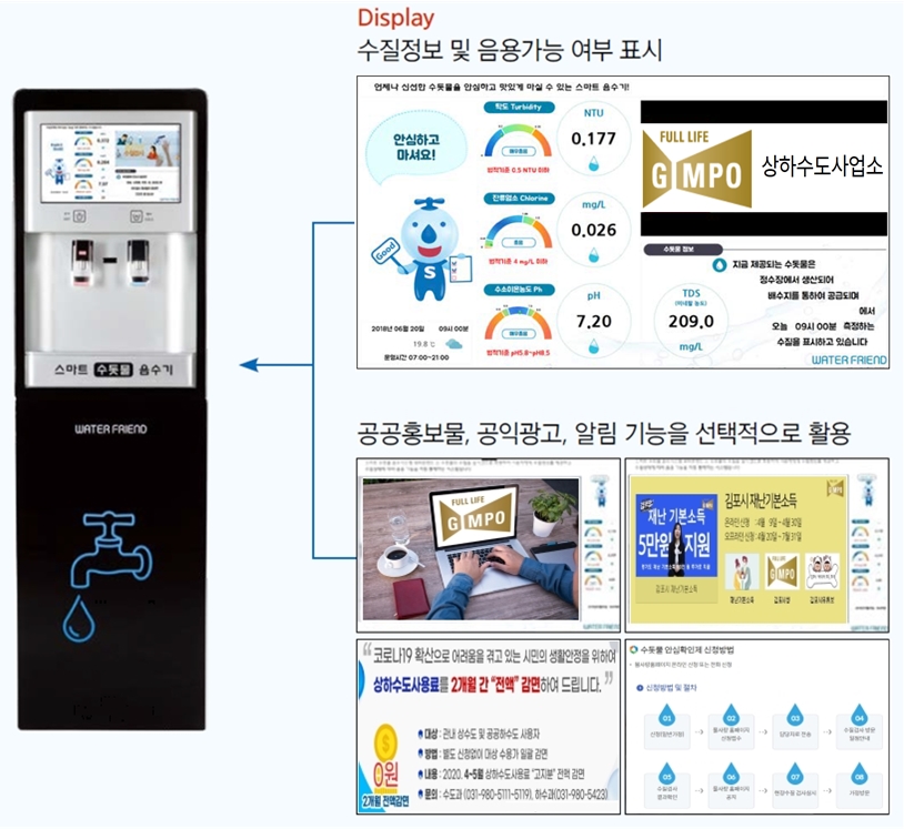 모니터에는 실시간 수질측정 결과뿐만 아니라 각종 행사와 금빛수 등 시정홍보 영상도 볼 수 있다. 또 저수조(탱크) 담수 공급으로 염소 저감을 통해 음용감을 향상시킬 수 있다. 뿐만 아니라 야간·휴일 등 사용하지 않을 때는 자동배수와 건조로 신선한 수돗물을 제공할 수 있어 1석 4조 효과를 누릴 수 있다.