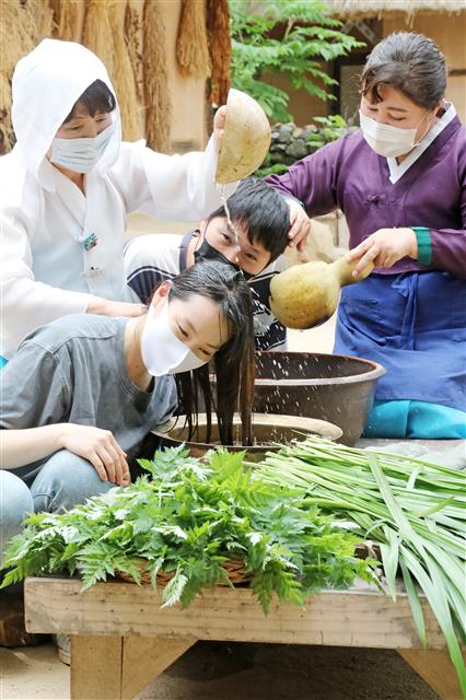 경기 내일은 단오… 창포물에 머리 감기 입력 2020 06 23 18:00 수정 2020 06 24 03:29 기사 소리로 듣기 다시듣기 내일은 단오… 창포물에 머리 감기단오를 이틀 앞둔 23일 오후 경기 용인 한국민속촌에서 시민들이 창포를 삶은 물로 머리를 감으면 재액을 막는다는 세시풍속을 체험하고 있다.뉴스1 단오를 이틀 앞둔 23일 오후 경기 용인 한국민속촌에서 시민들이 창포를 삶은 물로 머리를 감으면 재액을 막는다는 세시풍속을 체험하고 있다.뉴스1 ⓒ 트윅, 무단 전재 및 재배포 금지