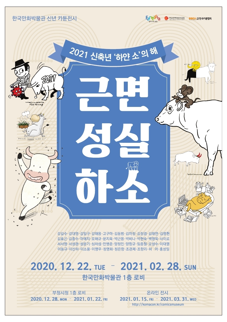 한국만화박물관 1층 로비에서 내년 2월 28일까지 열리는 신년 카툰전은 한국카툰협회 40명 작가의 하얀 소를 소재로 한 40점의 카툰 작품을 만나볼 수 있다.
