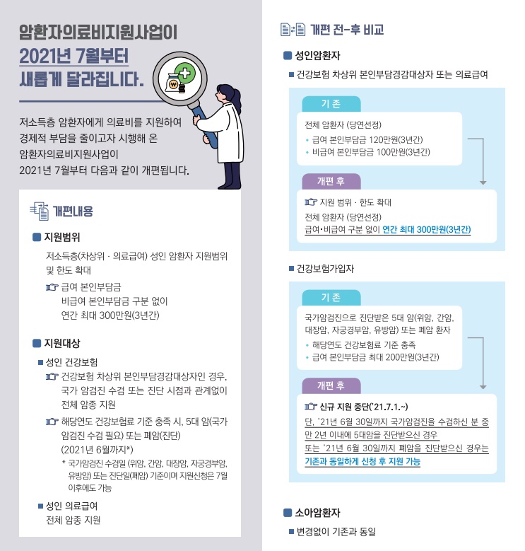 소아암 건강보험가입자는 기존대로 전체 암종을 지원하며 소득·재산 조사 후 기준 충족 시, 급여·비급여 구분 없이 ▲백혈병 3000만원 ▲기타암 2000만원(조혈모세포 이식 시 3000만원) 지원 가능하다.