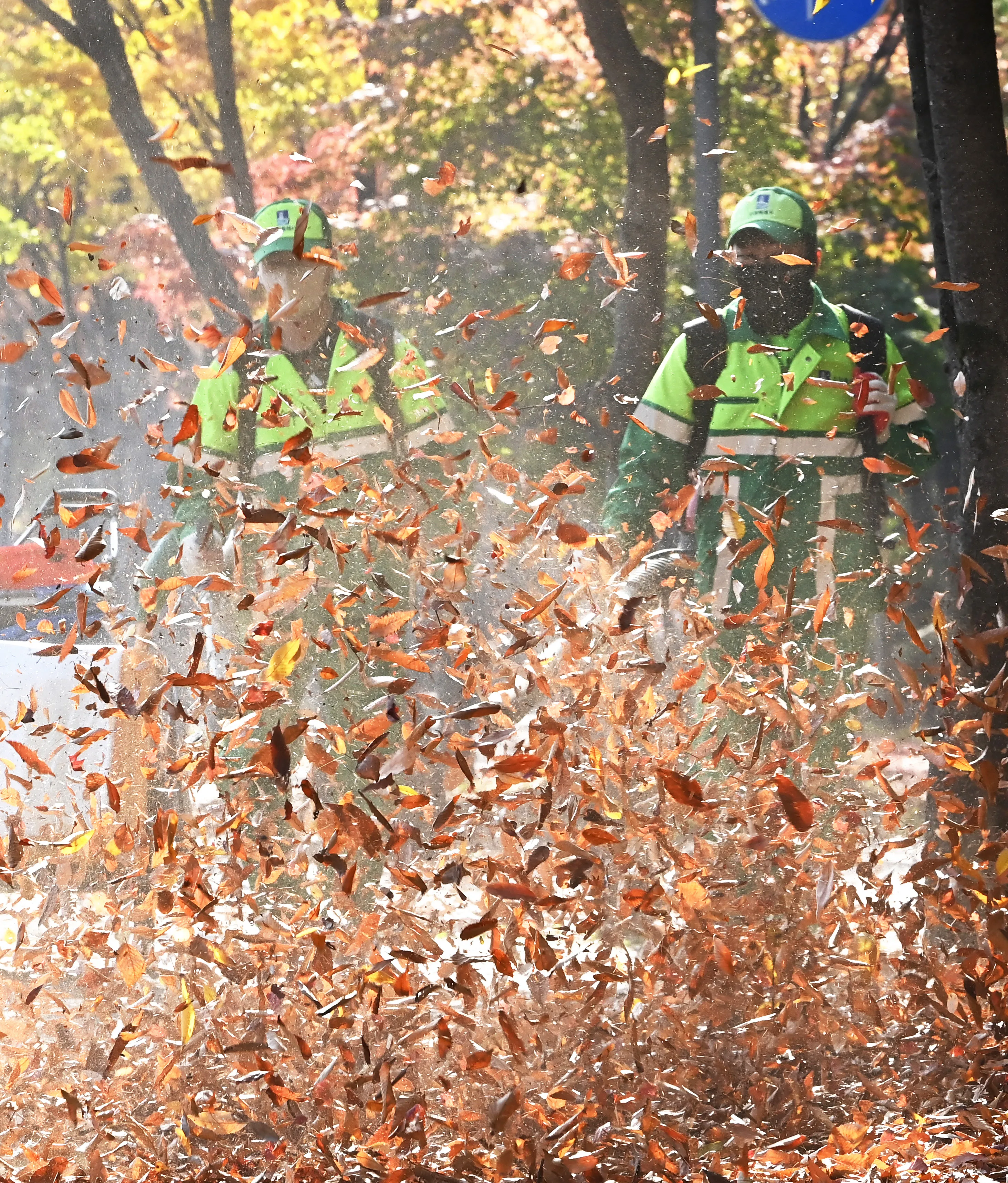 11일 경기 수원시 영통구 매탄3동 가로수길에서 환경관리원들이 전동 송풍기를 이용해 낙엽을 청소하고 있다. 기상청은 12일 아침 최저기온이 7∼13도, 낮 최고기온은 17∼22도로 평년보다 3~5도 가량 높은 ‘포근한 가을’ 날씨가 이어지겠다고 예보했다. 뉴시스