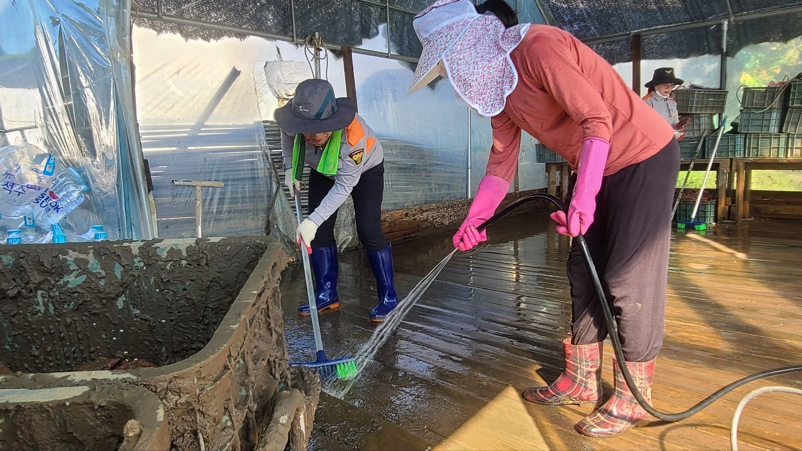 27일 이른 아침, 고양·일산소방서 소속 의용소방대원 60여명이 가평 상면에 있는 한 우렁이 사육농장 앞에 도착했다. 투명 비닐하우스 농장 내부는 그야말로 찜통이었지만, 의용소방대원들은 집단 폐사한 우렁이 사육농장 내부 수로에 쌓인 진흙을 손수레와 삽으로 퍼내는 등 마치 자신의 일처럼 구슬땀을 흘렸다. 일부 대원은 바닥 진흙에 빠지거나 손에 물집이 잡힌 채 작업을 이어갔다.
