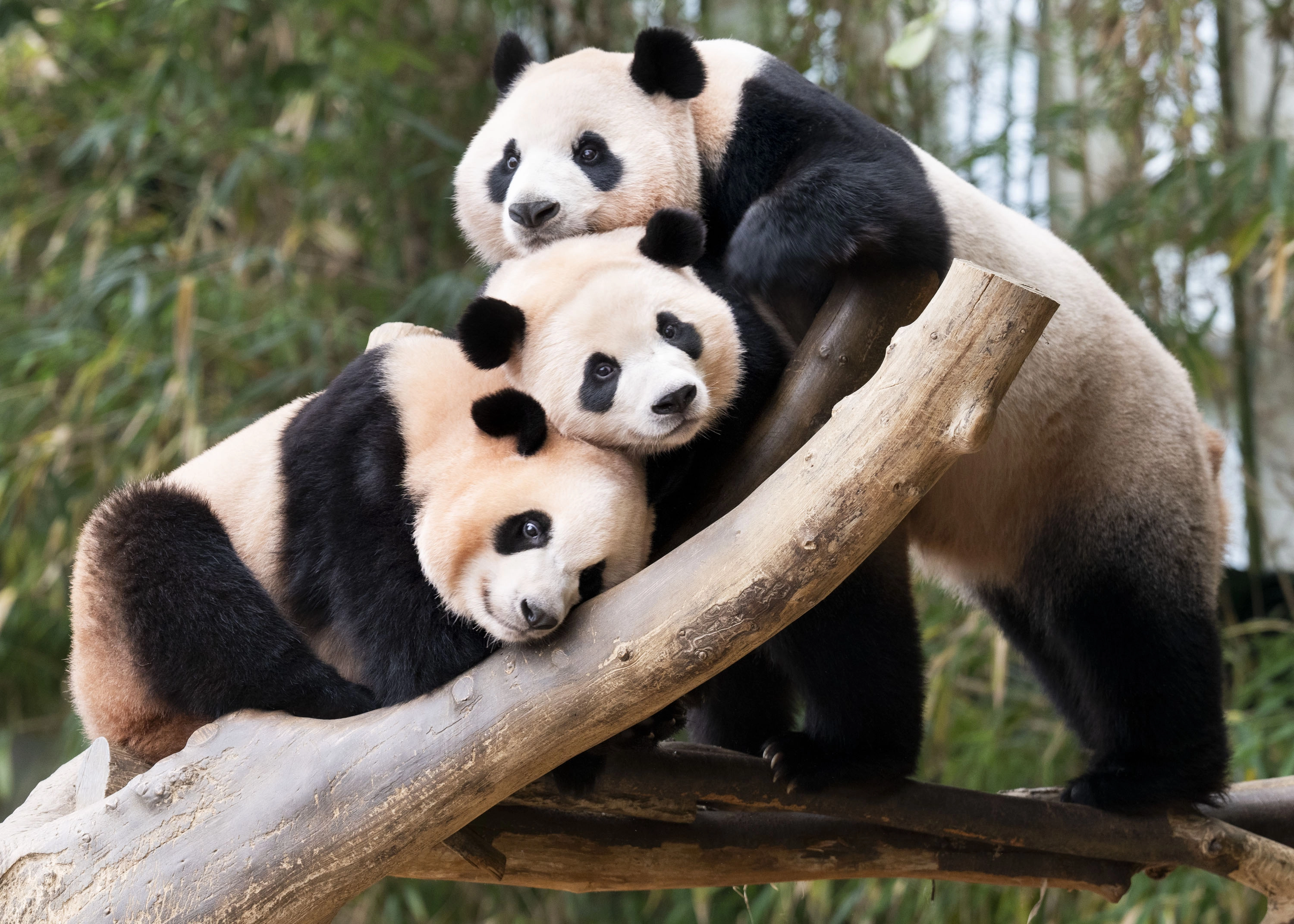 국내 최초 쌍둥이로 태어난 에버랜드 판다 자매 루이바오와 후이바오가 엄마 아이바오 품을 떠나 홀로서기에 나섰다. 판다는 보통 태어난 지 1년 반에서 2년 지나면 엄마로부터 독립하는데, 두 자매는 지난달 7일 두 돌을 맞았다. 아이바오와 쌍둥이는 12일 셋이 함께 있는 모습이 마지막으로 일반에 공개됐다. 사진은 전날 경기 용인시 에버랜드 판다월드에서 루이바오(왼쪽)·후이바오(가운데)·아이바오가 함께 있는 모습.