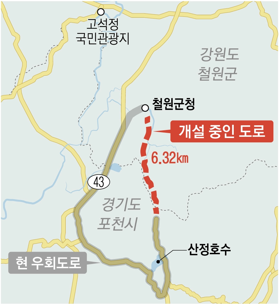 이 사업은 2022년 포천시와 철원군이 상생협력 협약을 체결하며 추진됐다. 그러나 포천시 구간인 산정호수~산안고개 520m는 경기도 예산 지원이 지연돼 착공이 늦어지고 있다. 포천시는 자체 재원 투입을 전제로 실시설계 용역 중이다.