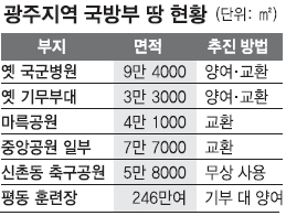 이번에 넘겨주거나 바꾸기로 한 땅은 국방부 소유인 서구 옛 국군광주병원, 옛 기무부대, 마륵·중앙공원 일부 토지 등 24만 5000㎡와 시 소유인 서구 서창동 양묘장 부지 17만㎡다. 시는 국방부로부터 옛 국군광주병원(9만 4000㎡·감정가 236억원)과 옛 기무부대(3만 3000㎡·75억원) 토지의 절반인 6만 3000㎡(155억원)를 무상 양여받고 나머지 토지는 시 소유 양묘장 부지(137억원)와 교환하기로 했다.