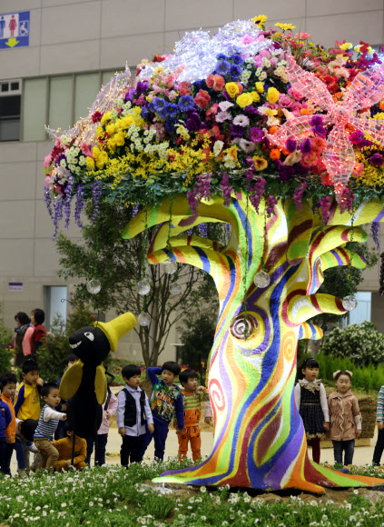 봄꽃 모자 쓴 나무  27일 광주 김대중컨벤션센터에서 열리는 ‘2014 광주 봄꽃박람회’를 미리 찾은 어린이들이 꽃으로 장식한 나무 조형물을 둘러보고 있다. ‘꽃과 생활 그리고 힐링’을 주제로 28일부터 다음 달 6일까지 열리는 박람회에선 물빛정원, 꽃향기 텃밭공연, 숲속의 작은 학교, 장미정원, 시민참여마당 등이 선보인다.<br>광주 연합뉴스
