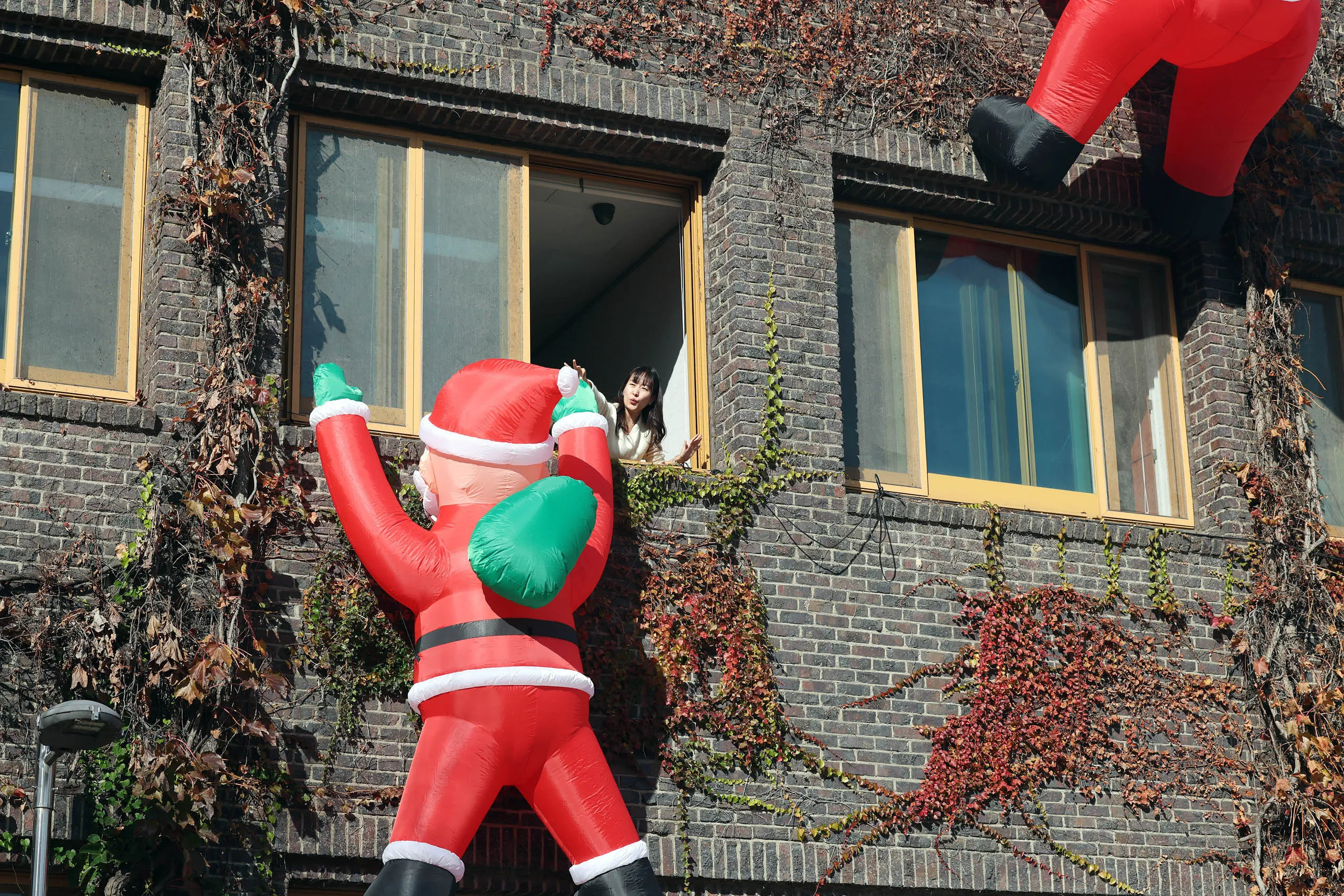 3일 광주 북구청 청사 외벽에 어린이에게 선물을 주기 위해 벽을 타는 산타 조형물이 설치돼 있다. 북구는 크리스마스와 연말을 맞아 주민들에게 꿈과 희망을 주기 위해 조형물을 설치했다고 밝혔다.