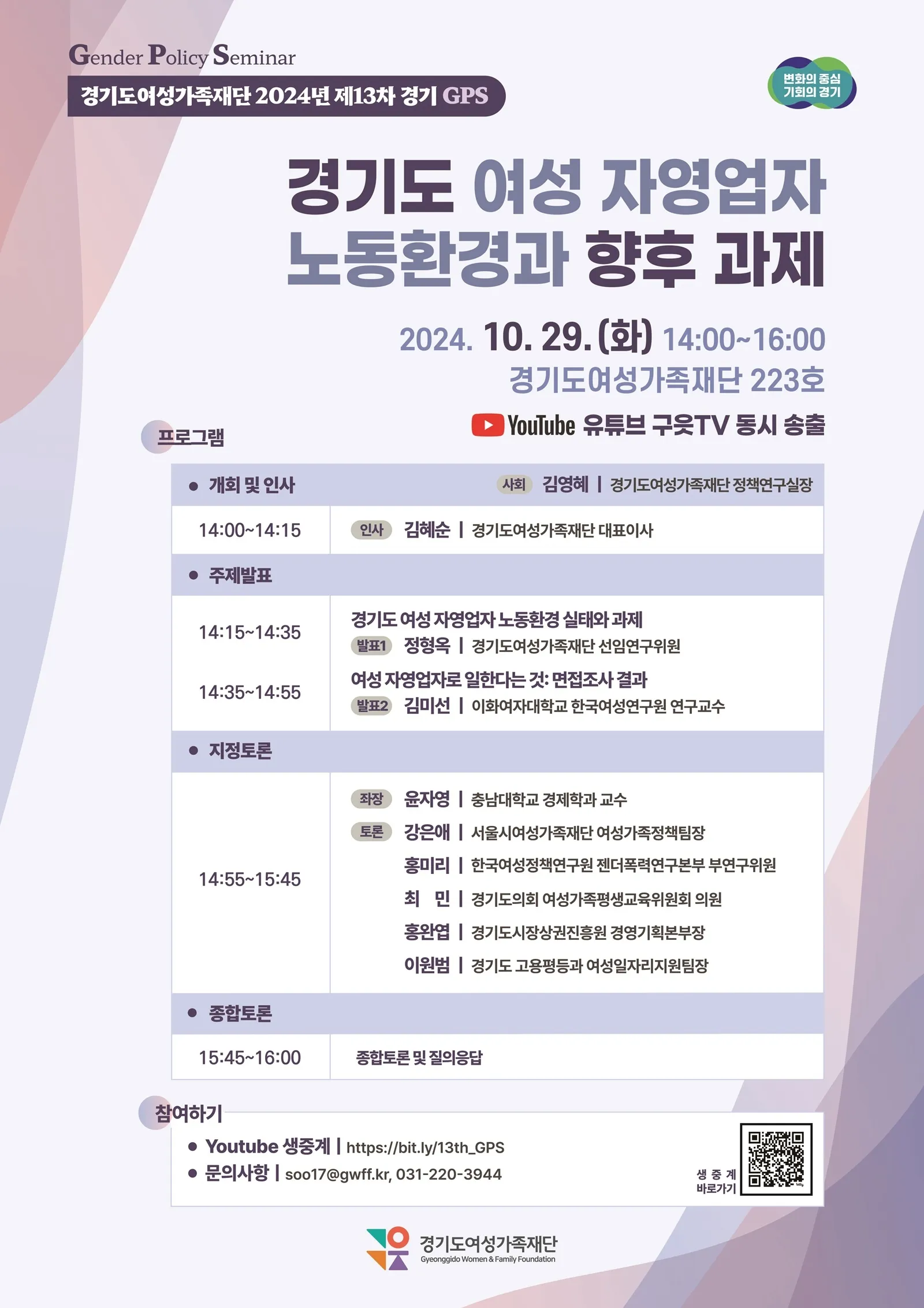 경기도 여성가족재단은 29일 재단에서 세미나를 갖고 ‘경기도 여성 자영업자 노동환경 실태와 과제’ 설문조사 결과 발표와 함께 연구조사 결과를 바탕으로 ‘여성 자영업자로 일한다는 것’이라는 주제 발표를 통해 여성 자영업자들이 겪는 일·생활 균형의 어려움, 사회적 인식과 차별, 안전 문제에 대한 사례를 보다 심층적으로 분석한다.