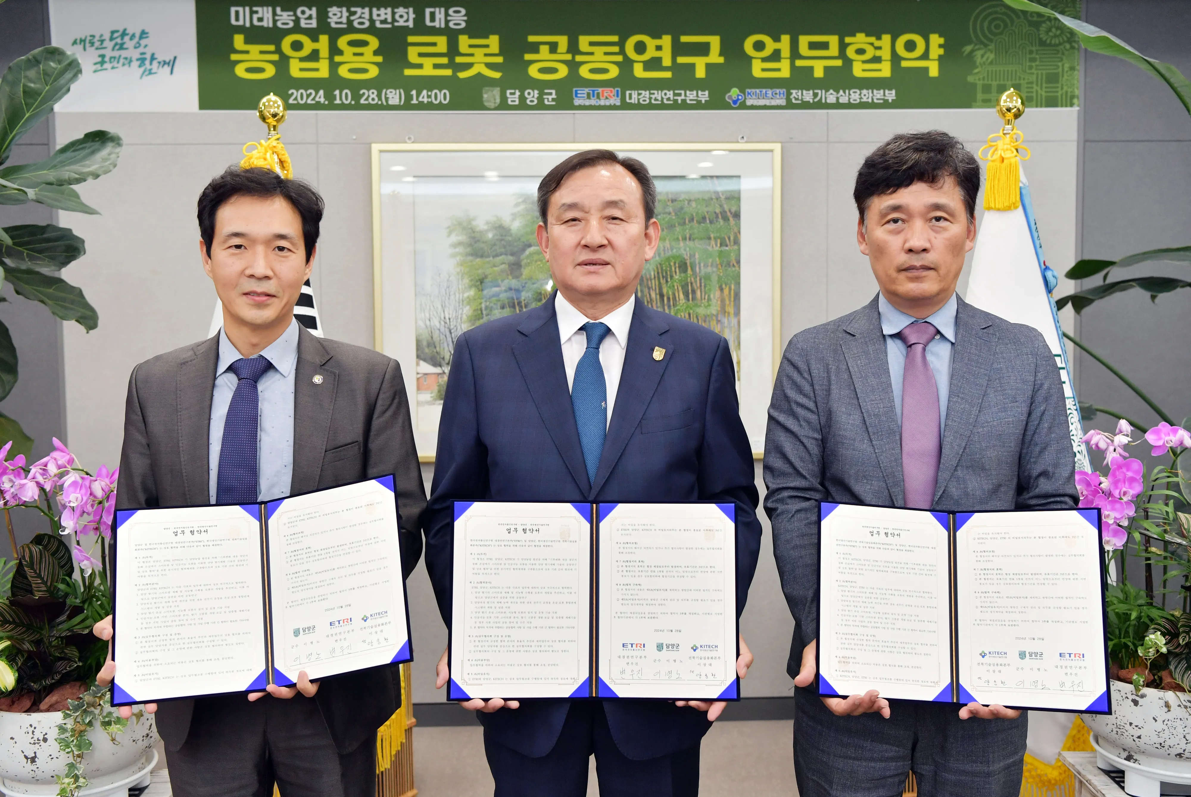 담양군은 한국전자통신연구원(ETRI) 대경권연구본부, 한국생산기술연구원(KITECH) 전북기술실용화본부와 함께 농업용 로봇 및 스마트팜 공동연구를 위한 업무협약(MOU)을 체결했다.