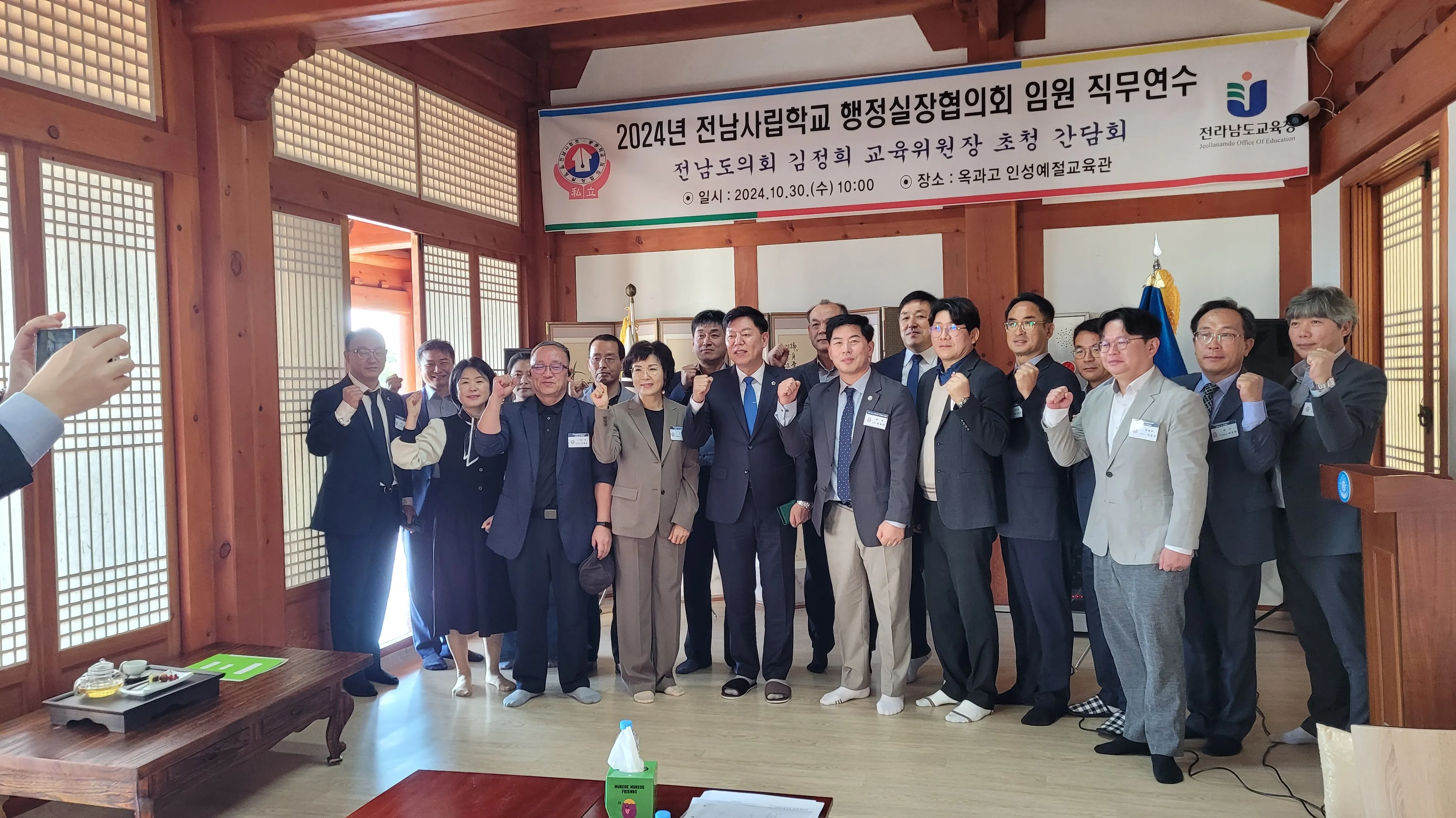 전남사립학교 행정실장협의회 임원들이 지난 30일 옥과고 인성예절교육관에서 ‘역량강화 직무연수’를 개최해 눈길을 끌었다. 임원 25명이 참석한 협의회에서는 ‘김정희 전남도의회 교육위원장 초청 간담회’를 가져 소통의 시간을 가졌다.