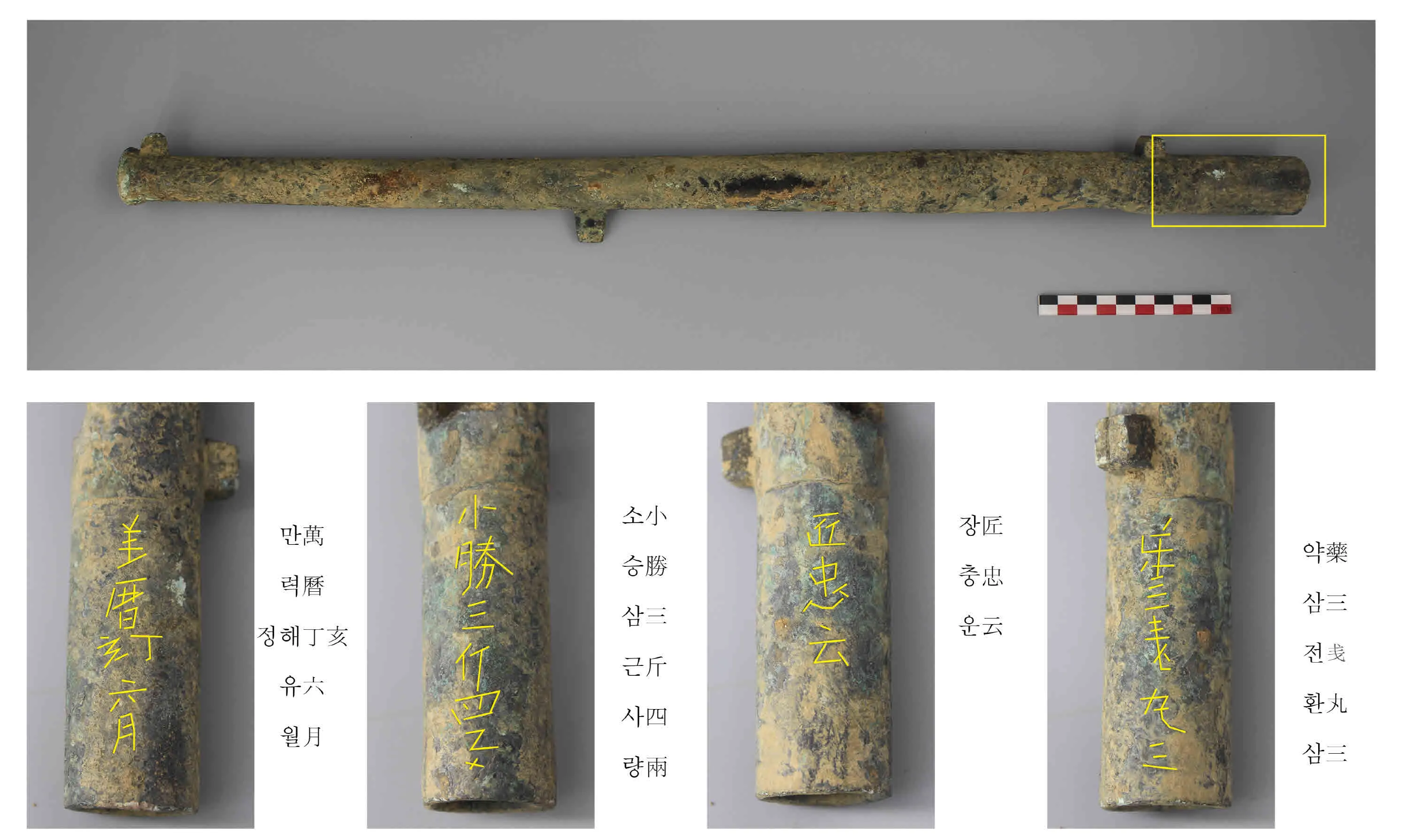 각인된 명문에 따르면 소승자총통(1점) 제작 시기는 1587년(선조20년) 6월, 무게는 3근 4량, 화약량은 3전, 총탄은 3개다. 제작한 장인의 이름은 ‘충운’이다.