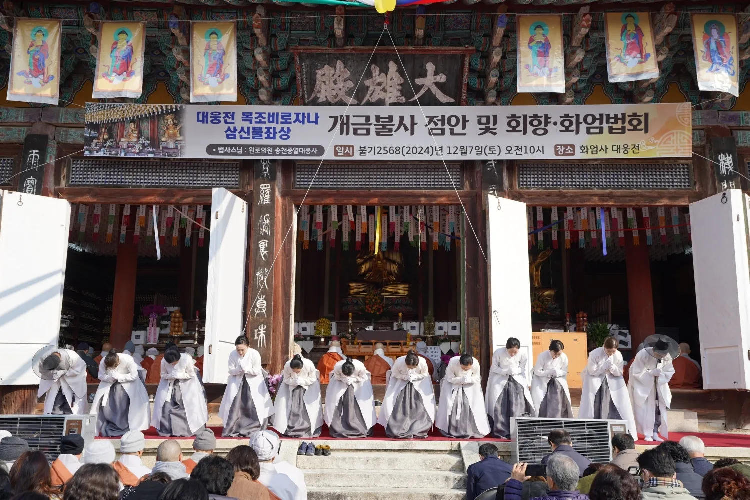 화엄사가 대웅전 목조비로자나삼신불좌상(국보 336호) 개금불사 점안법회 및 2024년 화엄법회 회향식을 열었다.
