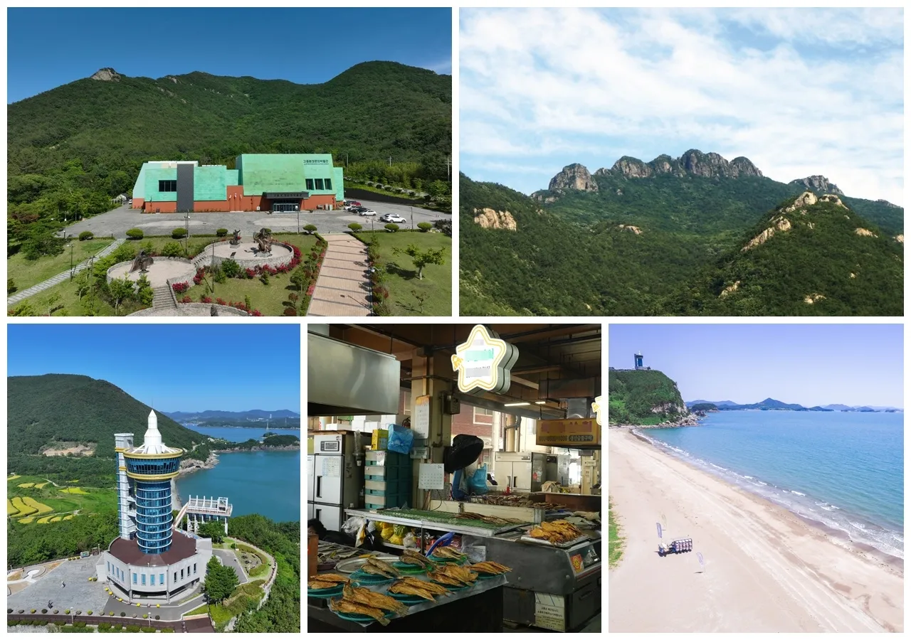 위쪽부터 시계방향으로 고흥분청문화박물관, 팔영산, 남열해돋이해수욕장, 고흥전통시장, 고흥우주발사전망대