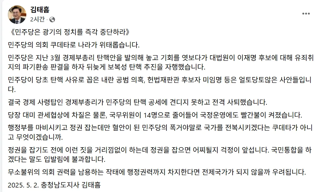 김태흠 충남지사 “민주당, 광기의 정치를 즉각 중단하라”