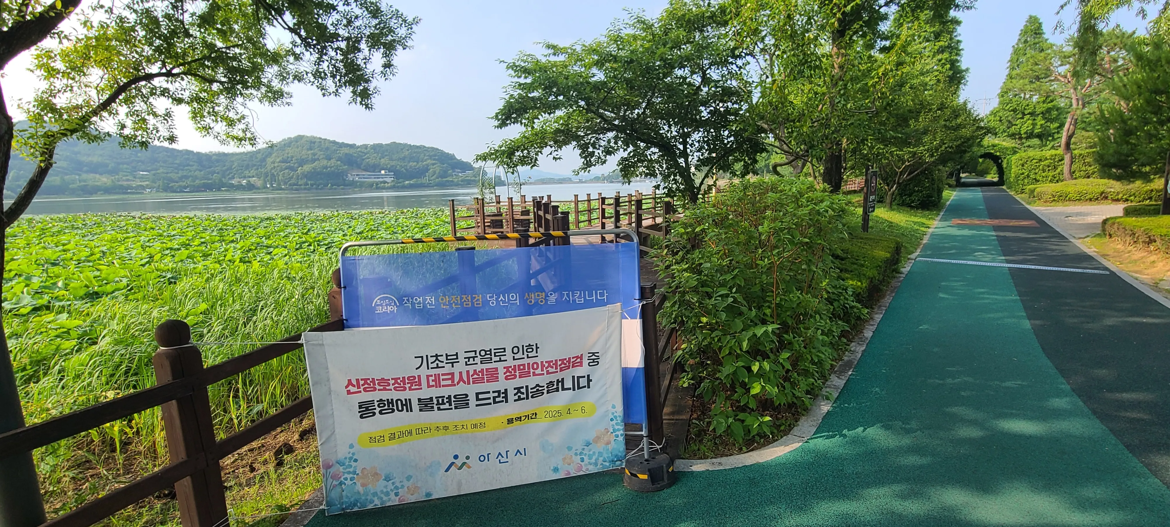 올해 초 충남 1호 지방 정원으로 등록한 아산 신정호 지방 정원 내 일부 데크 안전도가 취약해 철거 후 재시공이 추진된다.