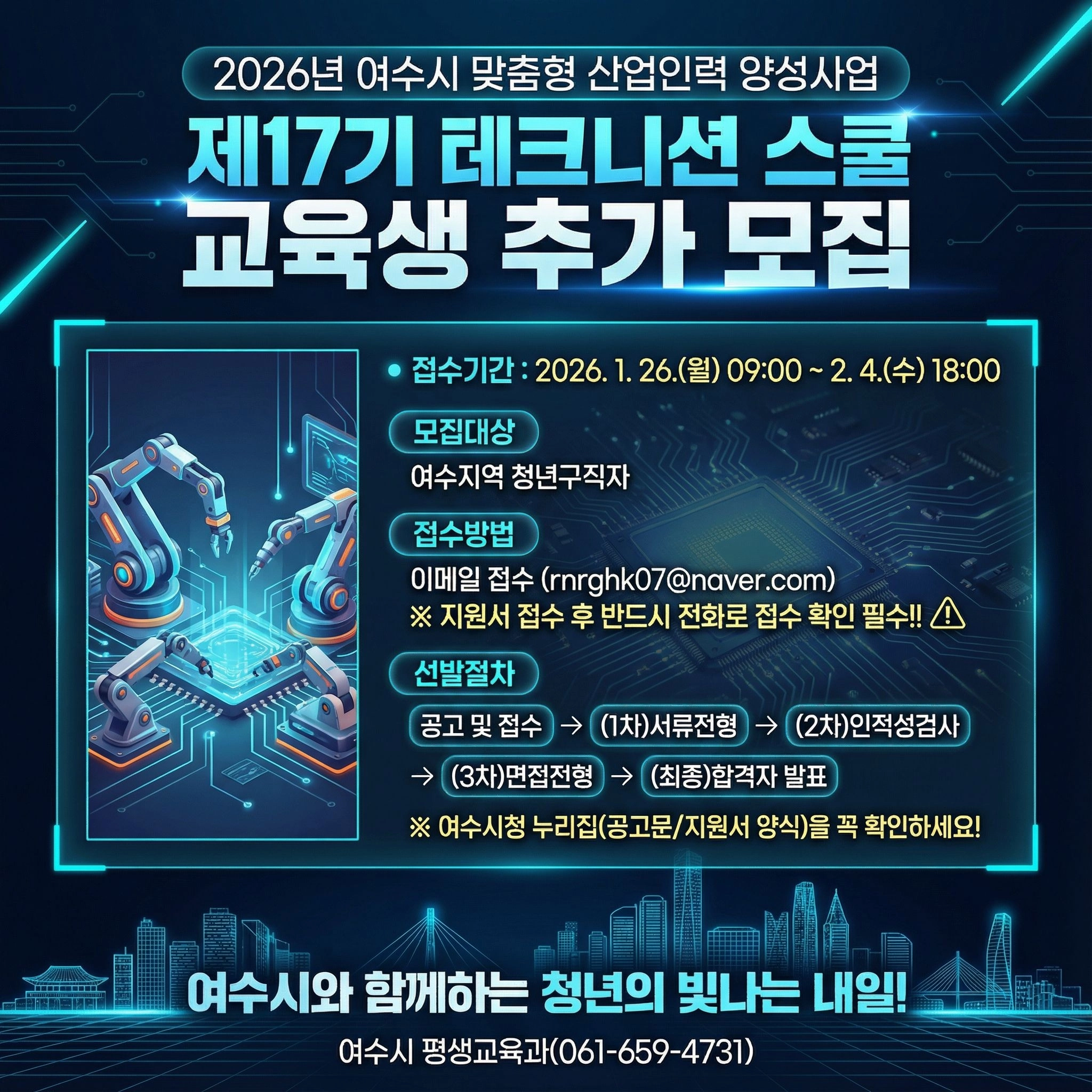 전남 여수시가 지역 산업 수요에 맞는 전문 인력을 양성하기 위해 추진하는 ‘2026년 여수시 맞춤형 산업인력 양성사업’의 일환인 ‘테크니션 스쿨 제17기’ 교육생을 추가 모집한다.