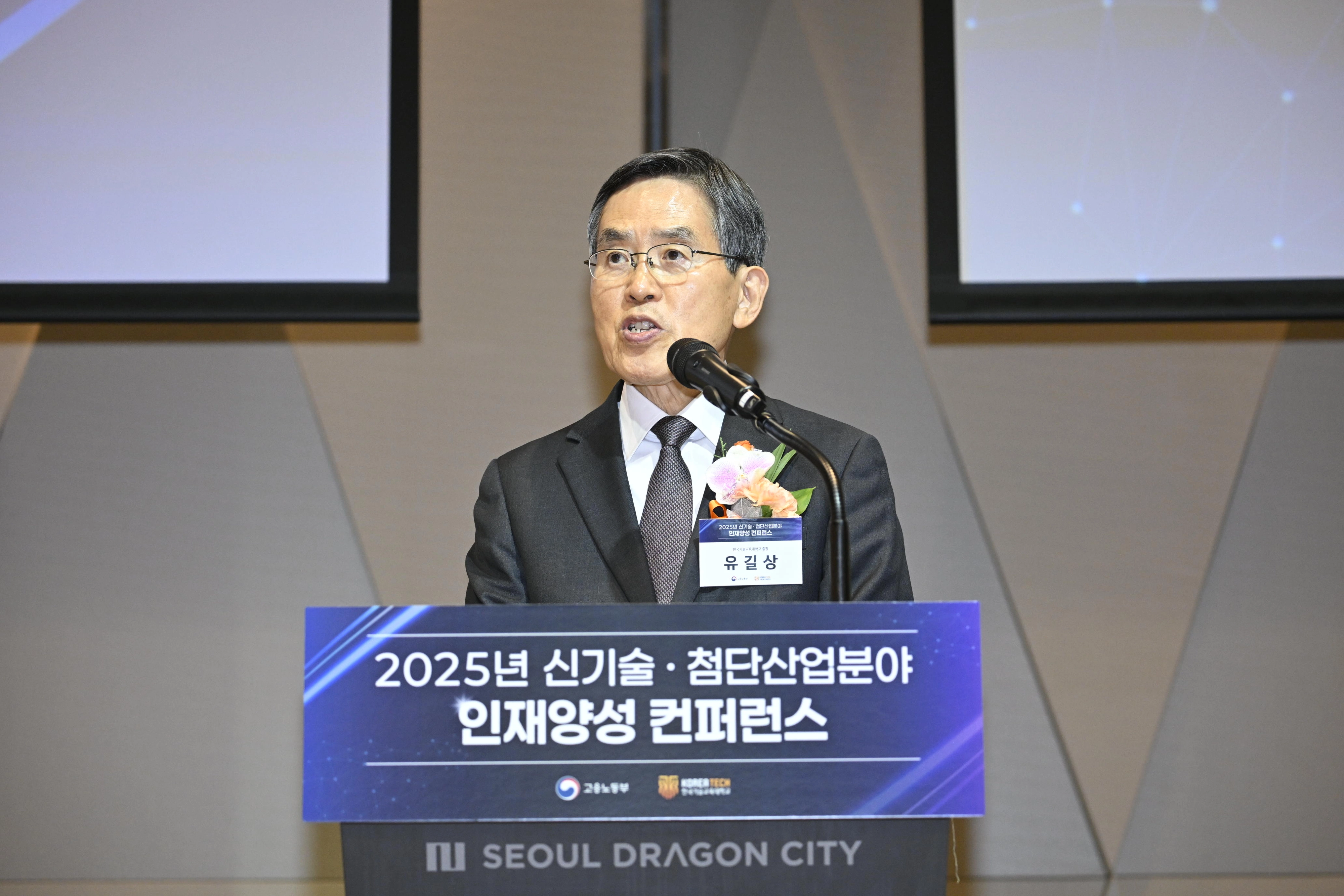 유길상 한기대 총장이 신기술·첨단산업분야 인재양성 콘퍼런스에서 인사말을 하고 있다. 한기대 제공